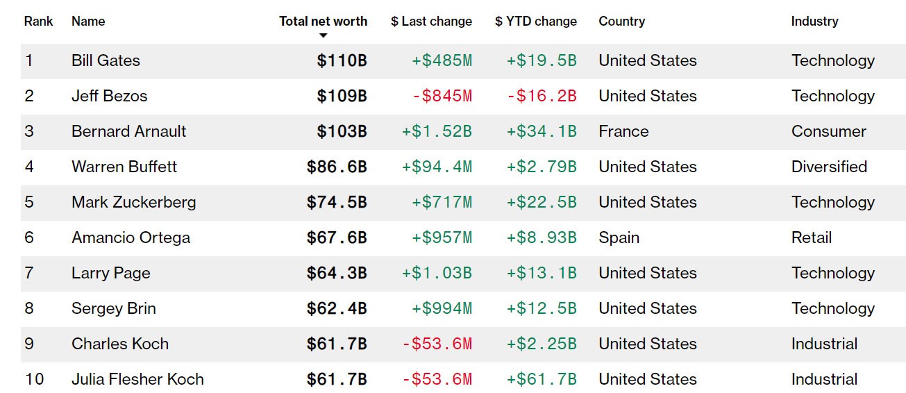 Dünyanın ən varlı insanları reytinqində ikinci pillədə 109 milyard dollarla “Amazon” kompaniyasınən rəhbəri Ceff Bezos, üçüncü pillədə isə aktivləri 103 milyard dollar həcmində qiymətləndirilən Fransanın “Louis Vuitton Moët Hennessy” kompaniyasının prezidenti Benua Arno qərarlaşıb.