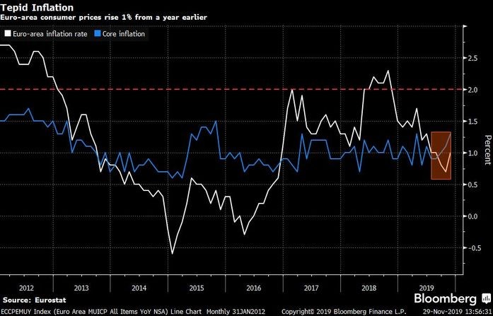 Avro Bölgəsində inflyasiya Oktyabrdakı 0.7%-dən Noyabrda 1%-ə yüksəlib. Proqnoz 0.9% idi.
