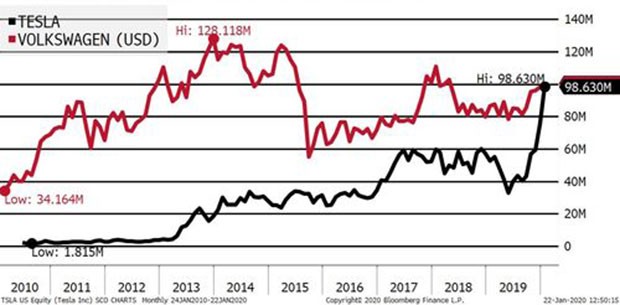 Nəticədə "Tesla"nın bazar dəyəri 100.1 milyard dollara çatıb. Almaniyanın avtomobil nəhəngi "Volkswagen AG" şirkətinin bazar dəyəri 100.6 milyard dollar ətrafındadır.