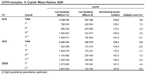 Türkiyə iqtisadiyyatı 2020-ci ilin ikinci rübündə 2019-cu ilin eyni dövrü ilə müqayisədə 9.9%, 2020-ci ilin 1-ci rübü ilə müqayisədə isə 11% kiçilib.