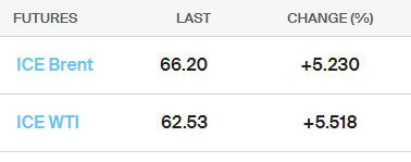 Marja xəbər verir ki, Bakı vaxtı ilə saat 07:30-da Brent nefti 5,2% bahalaşma ilə 66.20 dollardan, ABŞ xam nefti isə 5.5% bahalaşma ilə 62.53 dollardan ticarət olunub.