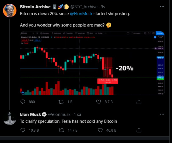 Musk, "Mr. Whale" adlı bir Twitter səhifəsinin etdiyi, "Bitcoin sərmayəçiləri qarşıdakı rübdə Tesla-nın alıb saxladığı Bitcoin-ləri satdığını fərq etdikləri zaman özlərini şillələyəcəklər. Elon Musk-a nifrət nəzərə alındığında, onu günahlandırmazdım..." paylaşıma "Həqiqətən" yazaraq cavab verib.