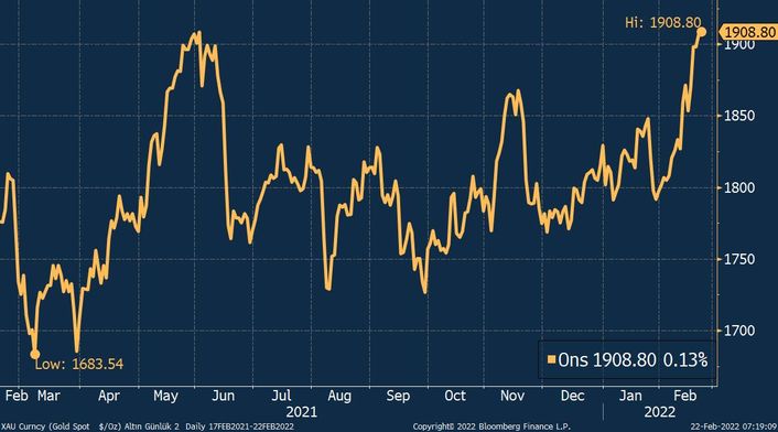 Rusiya prezidenti Vladimir Putinin Ukraynada gərginliyi artıran qərarlarından sonra qızılın qiyməti yenidən 1900 dolları keçərək, təxminən 1 ilin ən yüksək səviyyəsinə çatıb.Rusiya prezidenti Vladimir Putinin Ukraynadakı separatçı qüvvələri tanımasından sonra qızılın qiyməti yenidən 1900 dolları ötüb.