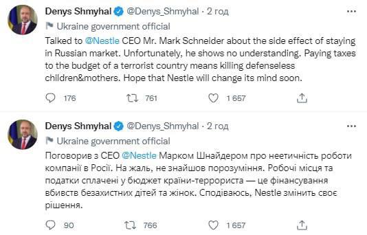 "Mən Nestle şirkətinin baş direktoru Mark Şnayderlə şirkətin Rusiyadakı qeyri-etik işi ilə bağlı danışdım. Təəssüf ki, mən onu razı sala bilmədim", - Ukraynanın baş naziri Denis Şmıqal bildirib.