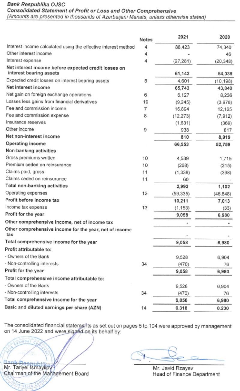 Konsolidə edilmiş audit hesabatına görə "Bank Respublika" qrupu 2021-ci ili 9 milyon 58 min manat xalis mənfəət ilə başa vurub. Qrup 2020-ci ili 6 milyon 980 min manat xalis mənfəət ilə bağlamışdı. Ötən il "Bank Respublika"nın cəmi aktivləri ilk dəfə 1 milyard manatı keçərək hesabat ilinin sonunda 1 milyard 141 milyon manat təşkil edib.