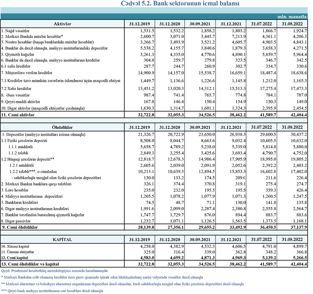 31.08.2022-ci il tarixində, sahibkarlıqla məşğul olan fiziki şəxslərin əmanətləri daxil fiziki şəxslərin 10 milyard 858,4 milyon manatlıq cəmi əmanətlərinin 6 milyard 548,1 milyon manatı və ya 60,3%-i milli valyutada, 4 milyard 310,2 milyon manatı və ya 39,7%-i xarici valyutada olub. Bu nisbət iyulun sonunda müvafiq olaraq 60,1% və 39,9% idi.