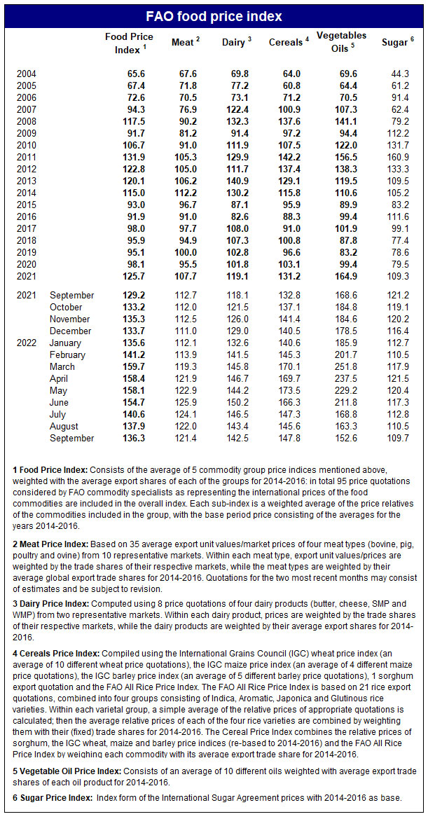 FAO-nun Ərzaq Qiymətləri İndeksi 2022-ci ilin sentyabrında orta hesabla 136,3 bənd təşkil edərək, avqust ayı ilə müqayisədə 1,5 bənd (1,1 faiz) azalaraq, ardıcıl 6 aylıq enişi qeyd edib. Sentyabr ayında İndeksin azalması bitki yağlarının beynəlxalq qiymətlərinin kəskin düşməsi və şəkər, ət və süd məhsullarının qiymətlərinin mülayim azalması ilə əlaqədardır. Yeni azalmaya baxmayaraq, İndeks ötən ilin müvafiq ayında öz dəyərindən 7,2 bənd (5,5 faiz) yuxarı qalıb.Birləşmiş Millətlər Təşkilatının (BMT) Ərzaq və Kənd Təsərrüfatı Təşkilatı (FAO) sentyabr ayı Qlobal Ərzaq Qiymətləri İndeksini açıqlayıb.