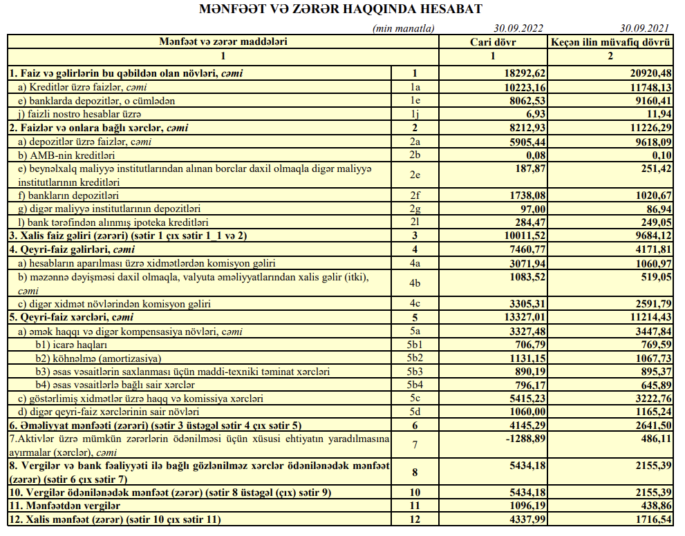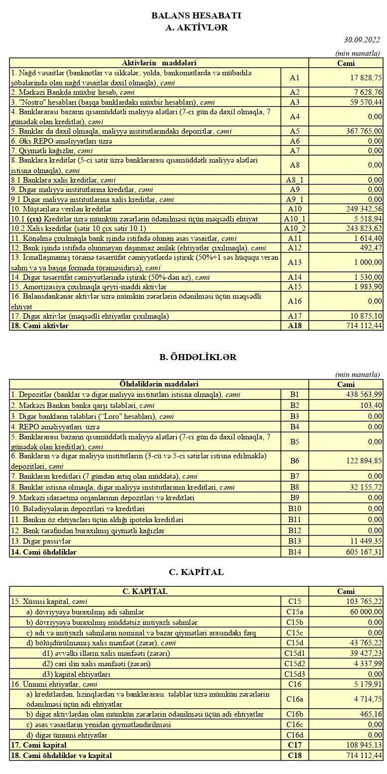 2022-ci ilin 9 ayında ASB-nin cəmi aktivləri 100 milyon manata yaxın azalıb.