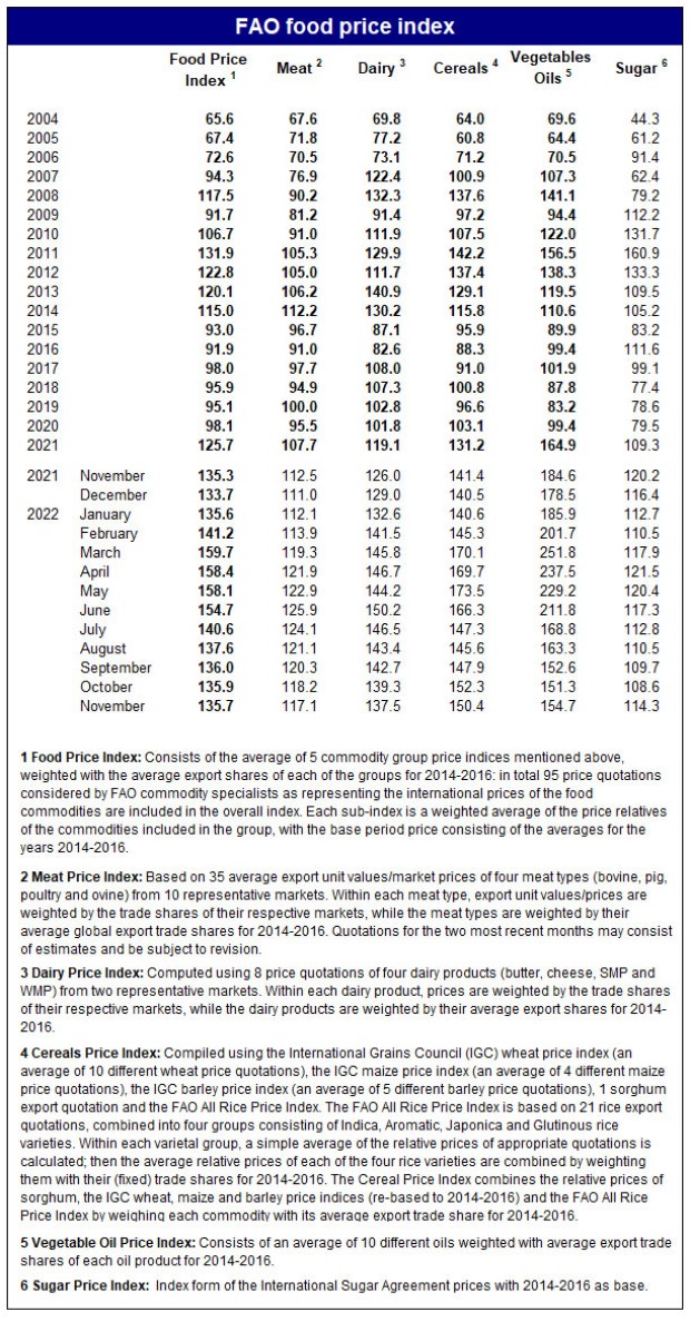 Daha çox satılan ərzaq malları səbətinin beynəlxalq qiymətlərində aylıq dəyişiklikləri izləyən FAO Ərzaq Qiymətləri İndeksi noyabr ayı ərzində orta hesabla 135,7 bənd təşkil edib ki, bu da oktyabrdakı səviyyəsindən 0,1% aşağıdır. İndeks 2021-ci ilin noyabrındakı səviyyəsindən cəmi 0,3 faiz yüksəkdir.