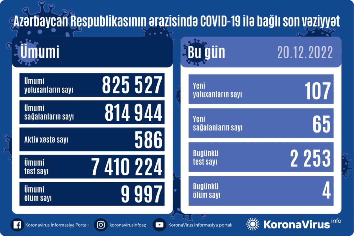 Azərbaycanda daha 107 nəfər COVID-19-a yoluxub, 4 nəfər vəfat edibAzərbaycan Respublikasında koronavirus (COVID-19) infeksiyasına 107 yeni yoluxma faktı qeydə alınıb, 65 nəfər müalicə olunaraq sağalıb.