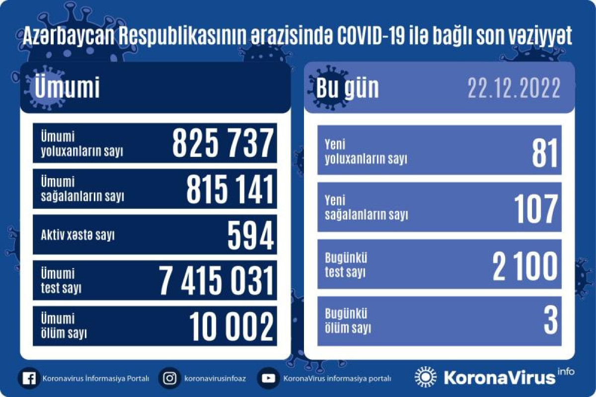 Azərbaycan Respublikasında koronavirus (COVID-19) infeksiyasına 81 yeni yoluxma faktı qeydə alınıb, 107 nəfər müalicə olunaraq sağalıb.