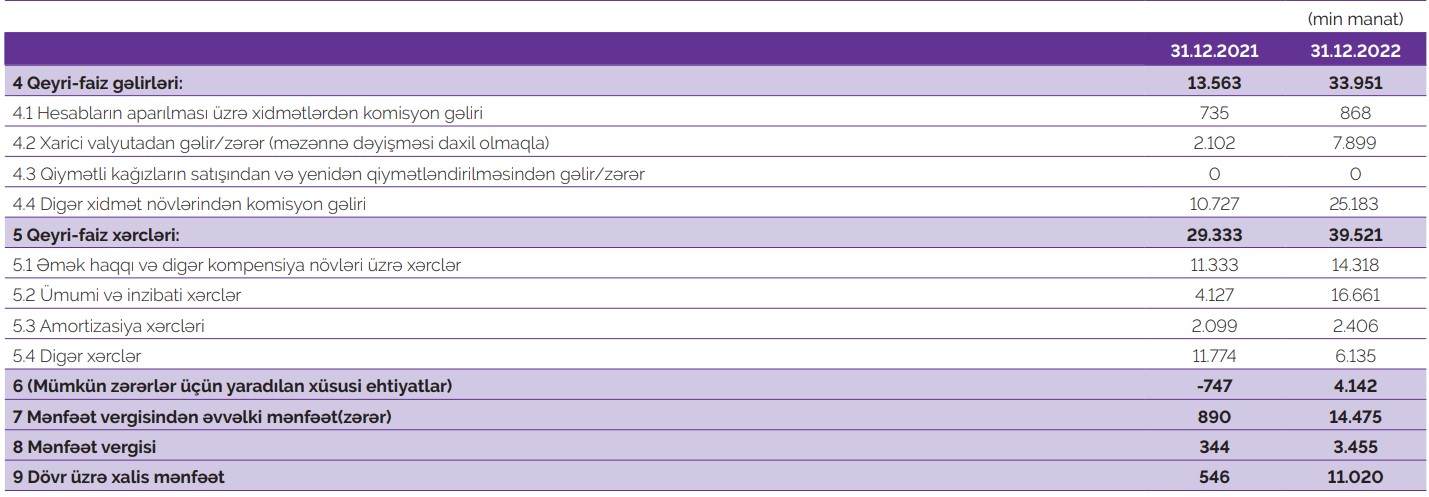 Hesabat dövründə Bankın gəlirləri 95% yüksəlməklə 69,2 milyon manat, xərclər 58,1 milyon manat olmuşdur.