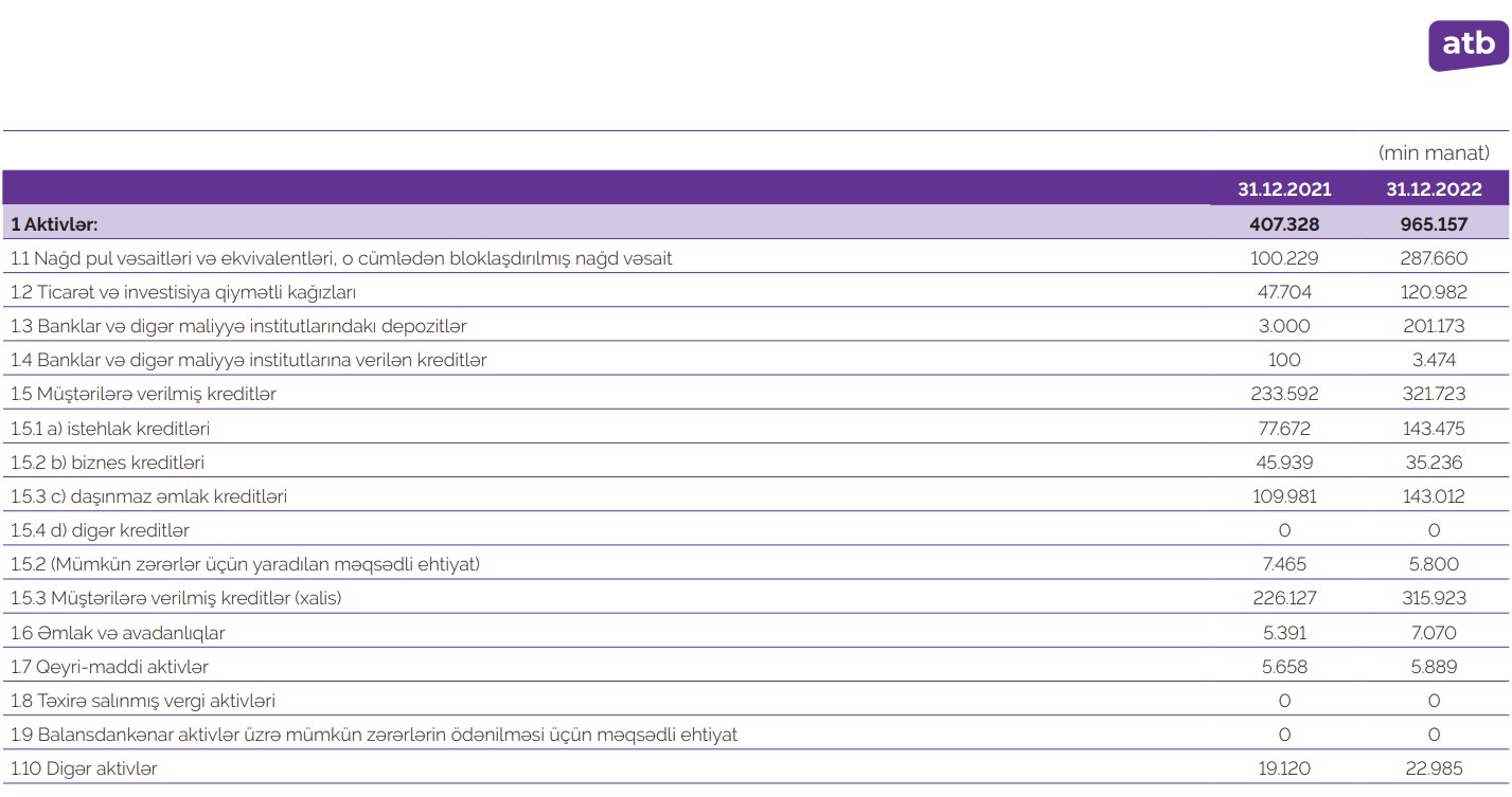 Qeyd edilib ki, dövlət bankı Azər Türk Bankın 01 yanvar 2023-cü il tarixinə aktivləri ötən ilin müvafiq dövrü ilə müqayisədə 140% artaraq, 965,2 milyon manat səviyyəsində olmuşdur.