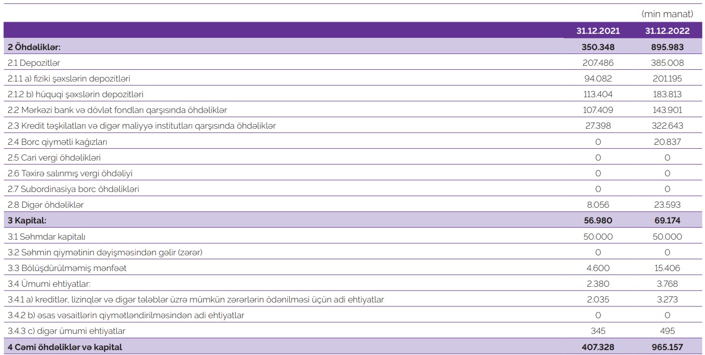 Cəmi bank öhdəliklərinin həcmi 155% artımla 896 milyon manat səviyyəsindədir.
