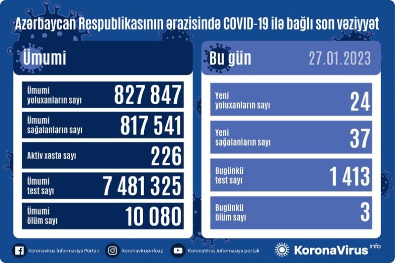 Azərbaycan Respublikasında koronavirus (COVID-19) infeksiyasına 24 yeni yoluxma faktı qeydə alınıb, 37 nəfər müalicə olunaraq sağalıb.