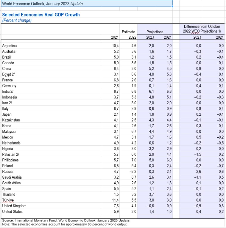 2023-cü il üçün proqnoz 2022-ci ilin Oktyabr ayındakı Dünyanın İqtisadi Mənzərəsi hesabatında proqnozlaşdırılandan 0,2 faiz bəndi yüksəkdir, lakin tarixi orta göstəricidən (2000-20119-cu illərdə orta hesabla 3,8 faiz) aşağıdır.